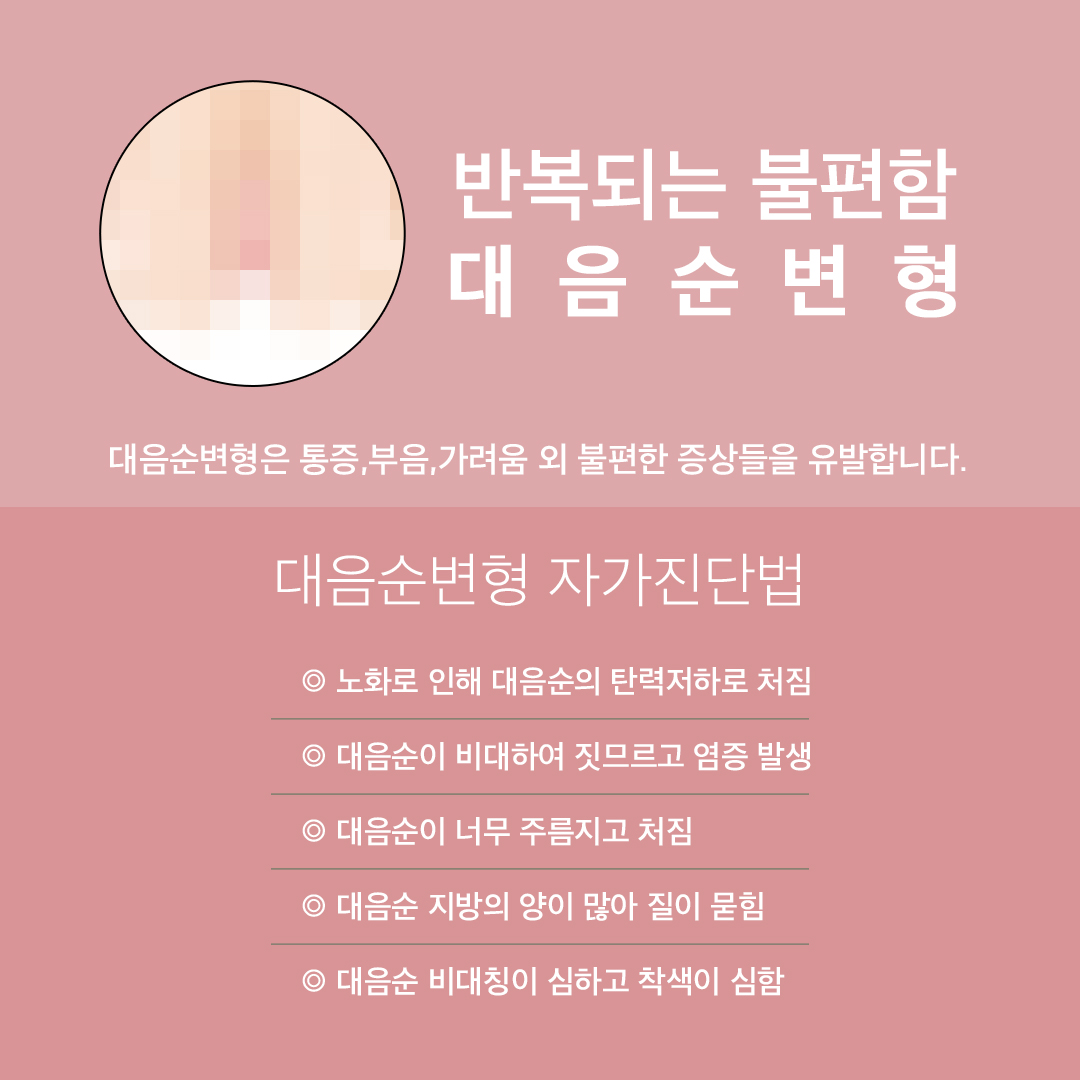 하지만 이러한 증상이 있다면 대음순 치료를 고려해보아야 합니다. 대음순 변형 자가 진단을 체크해보며 해당사항이 있는지 확인해 보세요.