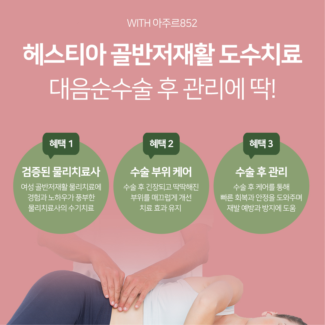 서울산부인과 헤스티아 여성의원에서는 골반저재활 도수치료를 도입하여 수술 후에도 환자들이 빠른 안정과 회복을 위한 준비가 되어 있습니다. 여성 도수치료 노하우와 경력이 풍부한 물리치료사의 수기치료로 수술 후 긴장되고 딱딱해진 외음부를 매끄럽게 풀어주며 통증과 붓기 완화에도 도움이 됩니다.