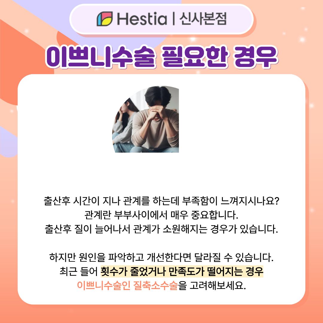 그렇다면 이쁘니수술 필요한 경우로 볼 수 있습니다. 특히 자연분만으로 출산한 이후, 나이가 들면서 만족감은 더 떨어질 수 있는데요.