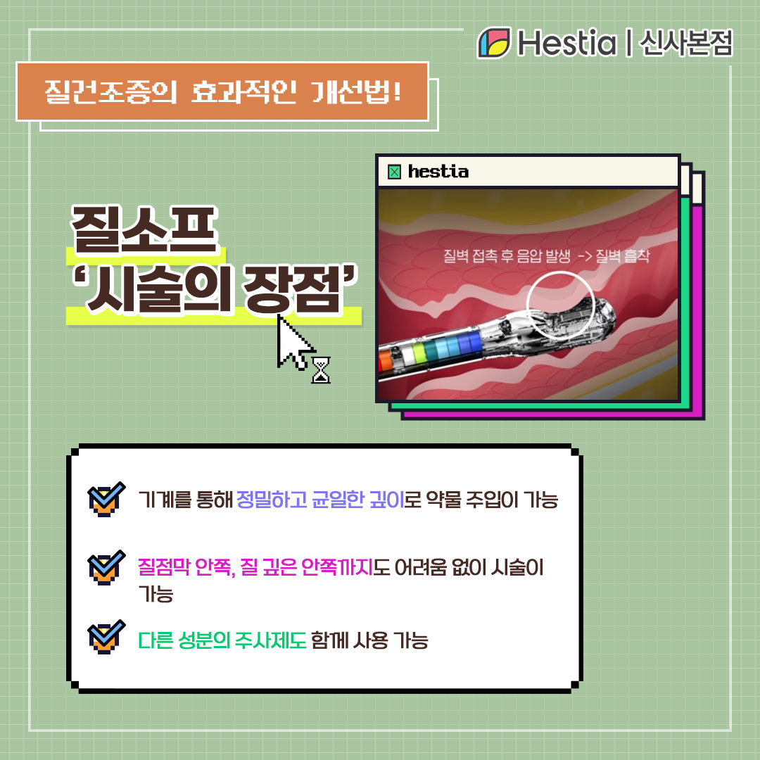 진행이 가능하다 보니 그만큼 질건조증치료에 인기가 더 많은 시술입니다.
